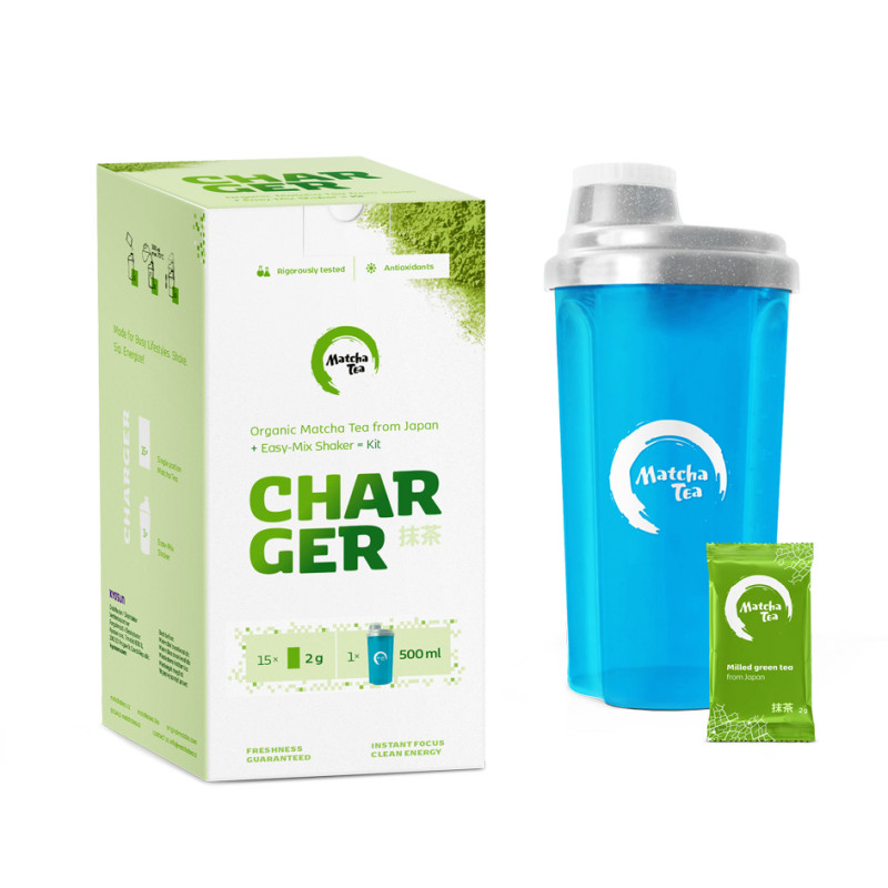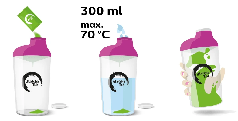 Praktické balení unikátního japonského čaje a shakeru 500ml pro snadnou příravu nápoje.